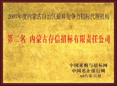 • 2008年度內蒙古自治區最具競爭力招標代理機構第二名